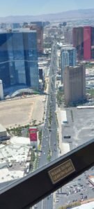Hierna liepen we naar The Strat. Dit is een hotel met ernaast een hele hoge toren (350meter) waarin je met een lift naar een observatieplatform kunt. Wij kochten (een veel te duur) kaartje om naar boven te mogen en genoten van het weidse uitzicht bovenin de toren.