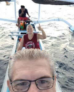 Via reisvrienden die nu op Bali wonen komen we gelukkig in contact met Putu Sugra en hij neemt ons met een privé boot op een diervriendelijke manier mee de zee op. We vertrekken een uurtje later dan de andere boten en beginnen op zee eerst eens rustig met een kopje thee en een door zijn vrouw gemaakt ontbijtje van gebakken banaan.