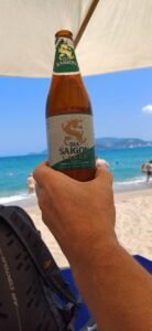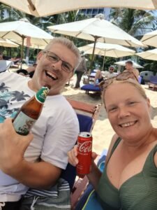 We huurden twee strandbedjes voor de hele dag en dronken biertjes en frisdrank voor €0,80.
