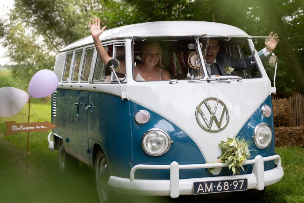 Zo kreeg iedereen aan het eind van de dag een goodiebag met daarin een wereldbol stressballetje, een kompas en tube zonnebrandcrème en was de bruidstaart versierd met een wereldbol, vliegtuig en paspoortje. Ook hadden wij een oud VW camperbusje als trouwauto.